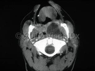 Patients present with a muffled voice, fever, sore throat, and dysphagia. There is deviation of the uvula to the unaffected side. Trismus and otalgia may be present. This infection usually affects young adults, but all ages can be affected. Older adults may have subtler symptoms. Laboratory findings include leukocytosis. Treatment consists of antibiotic therapy and surgical drainage.