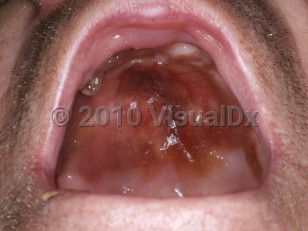 Nasal type extranodal natural killer (NK)/T-cell lymphoma, previously referred to as lethal midline granuloma, is a lymphoma characterized by Epstein-Barr virus (EBV) positivity and NK cells or, less commonly, cytotoxic T cells. The nasopharynx is most commonly involved (80% of cases), followed by the skin. Lesions are composed of firm papules or nodules that rapidly expand, ulcerate, and destroy surrounding tissue. Skin disease may be primary or secondary. Multiple sites can be involved, including the gastrointestinal (GI) tract, testes, salivary gland, uterus, and muscle. Hemophagocytic syndrome with pancytopenia can further aggravate the clinical course.