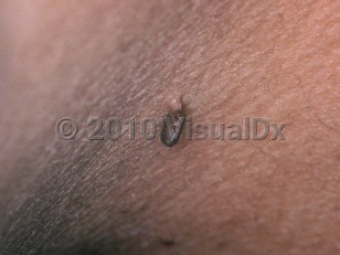 Acrochordons, also known as skin tags or fibroepithelial polyps, are common benign cutaneous growths. They present as small, skin-colored or brown, soft papules and are most commonly found in areas of frequent friction such as the eyelids, neck, axillae, and inguinal area. Acrochordons are usually asymptomatic but can become irritated by clothing or jewelry. Occasionally, skin tags twist upon their own stalk, which leads to strangulation of their blood supply and spontaneous necrosis of the skin tag. Acrochordons are associated with increasing age, pregnancy, diabetes, and obesity. Men and women are affected equally, and there is no difference in prevalence among different ethnicities and races.