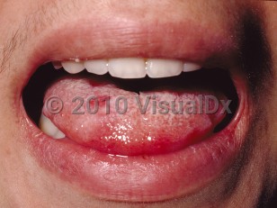 Clinical image of Behçet syndrome - imageId=61375. Click to open in gallery.  caption: 'An erosion and a small ulcer on the tongue.'
