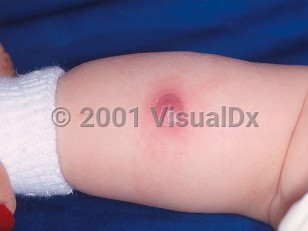 The disease can begin with findings of dermatitis and lymphadenitis in the infant. Subcutaneous abscesses, furunculosis, and suppurative panniculitis are all findings in this disease.