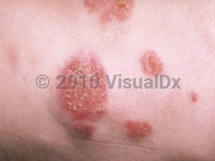 Cutaneous findings occur in 15%-20% of disseminated cases. The presentation is variable. Cellulitis, abscesses, papules, plaques, ulcers, sinus tracts, or purpura may all be seen. In patients with HIV, molluscum-like umbilicated papules are described.