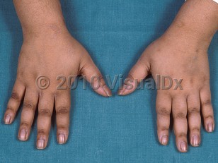 Skin changes in Cushing syndrome are manifold. The skin becomes thin and translucent, and ecchymoses occur following minor trauma. Thinning of the epidermis also leads to the plethoric appearance of the skin. Hyperpigmentation of the skin may be seen but is more common in pituitary or ectopic ACTH production. Although generalized, it tends to occur on sun-exposed areas. Addison disease also results in a similar pattern of hyperpigmentation in sun-exposed areas, but it also occurs in the palmar creases, areas of friction, the vermilion border, genital skin, and the oral mucosa.