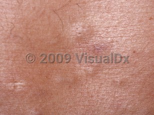 Eruptive vellus hair cysts (EVHCs) refers to the typical presentation of vellus hair cysts as multiple lesions as opposed to the less commonly occurring solitary vellus hair cyst. EVHCs present as multiple, small (1-4 mm), skin-colored to hyperpigmented follicular papules on the chest and upper abdomen. They may also occur on the proximal extremities, including axillae and buttocks, and have been reported on the face, including eyelids, and genital areas. They are usually asymptomatic but may be pruritic. They may become inflamed, and occasionally transepidermal elimination of cyst contents may occur.