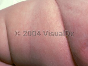 Later, hypo- and hyperpigmentation with herniation of the subcutaneous fat occurs. Fleshy and vascular papillomas can develop on mucosal, perioral, perigenital, and intertriginous areas. Nail dystrophy, sparse hair, and intellectual disability can also be present. The characteristic bony finding on x-ray is vertical striations in the metaphysis of long bones called osteopathia striata. Osteopathia striata is generally found in older patients.