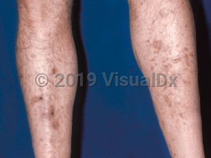 Diabetic dermopathy, commonly known as shin spots, is the most common cutaneous finding in patients with diabetes mellitus, presenting in up to 50% of diabetic patients. The etiology of diabetic dermopathy is unclear. Previously, ischemia had been thought to be a causative factor, but studies have found that blood flow to the dermopathy lesions was actually increased compared with other surrounding areas. Trauma is thought to be a causative factor.