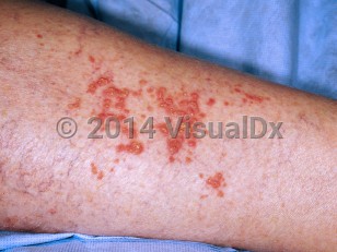 A large cluster of many discrete and confluent reddish papules, each with overlying thick scale, on the forearm.