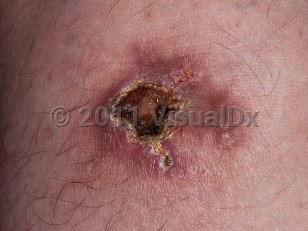 ES presents usually as an indolent, hard, tender nodule on the distal extremities of a young person (typically less than 40 years). Men are preferentially affected. Lesions on the head and neck have been reported. Aberrant mesenchymal tissue differentiation may contribute to the pathogenesis of ES. A history of trauma may precede the eruption of this lesion, although a causal relationship has not been established. The lesions often ulcerate.