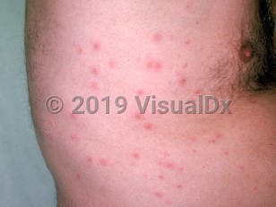 Clinically, Pseudomonas folliculitis is characterized by tender or pruritic folliculocentric papules preferentially localized to the trunk, buttocks, and extremities. Inflammation of Montgomery's follicles of the breast has also been described in one outbreak in Alaska. Symptoms typically develop within 1-4 days after exposure to the contaminated water source. Infection can be associated with mild fever, malaise, lymphadenopathy, and leukocytosis. The cutaneous eruption usually fades within 7-14 days without therapy.