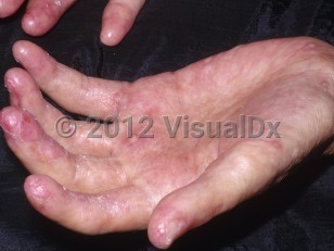 Clinical image of Chronic graft-versus-host disease - imageId=6320846. Click to open in gallery.  caption: 'Sclerodactyly with some pink, scaly, and eroded plaques on the fingertips. Note the thinned thumbnail and scattered hyperkeratotic papules on the palm.'