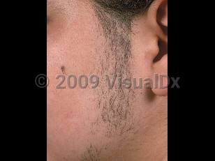 Clinical image of Hirsutism - imageId=647011. Click to open in gallery.  caption: 'Terminal hair growth in the beard area of a female patient secondary to a testosterone-secreting luteoma of pregnancy.'