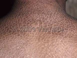 Clinical image of Ichthyosis vulgaris - imageId=333173. Click to open in gallery.  caption: 'A close-up of dry, dark brown scales with a fish skin-like appearance on the posterior neck and upper back.'