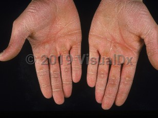 - Aquagenic keratoderma – Most often affects palms in patients in the second decade of life. Symptoms develop within 5 minutes of immersion in water.