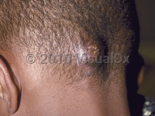 Clinical image of Kerion - imageId=180029. Click to open in gallery.  caption: 'A faintly violaceous nodule with superimposed pustules on the occipital scalp.'