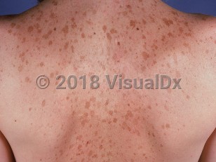 Solar lentigines are more common in individuals with skin phototypes I-III and a history of multiple sunburns. They are present in 90% of White individuals older than 60 years. They may also be seen in younger individuals with extensive UVR exposure and have been observed in children with xeroderma pigmentosum as young as age 5 years. They are typically located on sun-exposed skin, including the face, upper chest, shoulders, dorsal arms, and hands. Solar lentigines are asymptomatic, although they may enlarge, darken, or remain unchanged over time. The presence of solar lentigines has been shown to be a risk factor for the development of lentigo maligna melanoma. Patients with numerous solar lentigines are at risk for nonmelanoma skin cancers as well because of their UVR exposure.