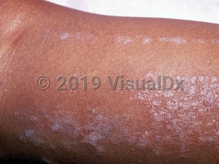 Clinical image of Lichen striatus - imageId=1234855. Click to open in gallery.  caption: 'Multiple violaceous scaly papules and plaques in a blaschkoid distribution on the calf.'