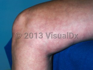 Congenital LR, known as cutis marmorata telangiectatica congenita (CMTC), presents with persistent LR that can involve the trunk or extremities. Generally, the mottled discoloration is limited to one extremity but can be more generalized. There may be a sharp demarcation at midline with truncal involvement. CMTC is sporadically inherited (or autosomal dominant) and can be associated with limb, facial, and spine anomalies along with cutaneous atrophy. The vascular changes of the skin may improve during the first few years of life and resolve completely in approximately 20% of children with CMTC.