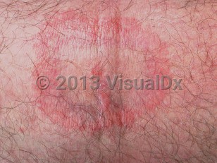 Clinical image of Lyme disease - imageId=280584. Click to open in gallery.  caption: 'A thin erythematous, annular plaque with a central thin erythematous papule.'