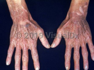 Pellagra is found worldwide but is more common in developing countries where poverty and malnutrition are more common (in part because the staple grains are not fortified with niacin). In addition to the skin, the neurologic system and gastrointestinal system are involved. Skin eruption tends to be photodistributed, symmetric, and erythematous. It may be accompanied by pain or itch. Various neurologic and gastrointestinal complaints such as dizziness, tremors, insomnia, fatigue, mood symptoms, nausea, vomiting, and diarrhea can be present and may precede skin manifestations.