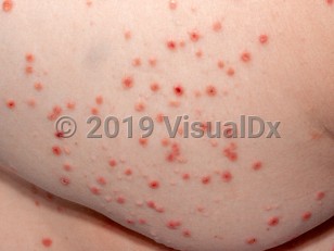 Pityriasis lichenoides chronica (PLC) is a related but more chronic form that is considered to be on a continuum with PLEVA. In contrast to the crusts, vesicles, and pustules seen in PLEVA, PLC takes on a more indolent course and is characterized by crops of scaly, erythematous papules that spontaneously regress over months to years. Overlapping cases of PLEVA and PLC do occur.