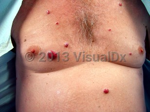 Clinical image of POEMS syndrome - imageId=6555944. Click to open in gallery.  caption: 'Smooth red papules and nodules scattered on the anterior trunk.'