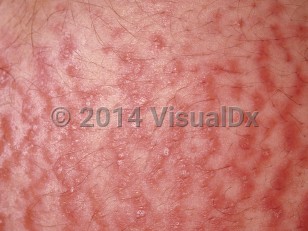 Polymorphic eruption of pregnancy (PEP), also known as pruritic urticarial papules and plaques of pregnancy (PUPPP), is the most common specific eruption of pregnancy. The etiology is unknown, but it may be related to skin distension. It is a benign condition that almost always begins in the third trimester of a first pregnancy or in the immediate postpartum period. This pruritic eruption develops in and around the abdominal striae and it may then spread to the extremities, chest, and back. It presents as erythematous or urticarial papules and plaques. Polymorphic clinical features are seen in around half of patients, including the development of eczematous papules and plaques, vesicles, and target lesions. Pruritus can be severe, leading to sleep disturbance.