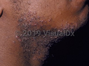 Pseudofolliculitis barbae, commonly known as "shaving bumps," is a chronic inflammatory disease of hair-bearing areas incited by shaving. It frequently occurs among populations where naturally curly hair is common. The close shaving of curly hair causes the hair to penetrate the wall of the follicle and extend into the dermis as it grows back or curves back on itself and pierces the skin, such as with an ingrown hair. The condition is more common among Black men, particularly policemen and military personnel, who may be required to be clean shaven.