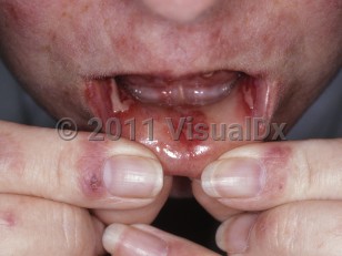 Clinical image of Pyostomatitis vegetans - imageId=5599600. Click to open in gallery.  caption: 'Large oral erosions, periungual erythema, and patchy erythema on the face.'