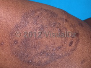 Tinea corporis usually appears as an annular plaque with a scaly, erythematous border. It may be itchy, especially in the case of Trichophyton rubrum infections, in which case, secondary lichenification from scratching may obscure its annular configuration. However, tinea corporis may be minimally pruritic or asymptomatic. It may be a superficial infection or it may affect follicular structures. When tinea infects the follicle, the condition may appear as a fungal folliculitis, or it may appear more deeply situated (deep dermatophytosis). Follicular infection is known as Majocchi granuloma.
