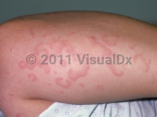 Clinical image of Urticarial vasculitis - imageId=43328. Click to open in gallery.  caption: 'Many discrete and confluent, annular and arcuate, erythematous, and edematous papules and plaques, on the arm.'