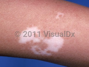 While most vitiligo patients are otherwise healthy, an association with autoimmune thyroid dysfunction (hyperthyroidism or hypothyroidism) has been demonstrated. In new-onset vitiligo patients with systemic symptoms, thyroid screening with antithyroid peroxidase (TPO) antibody and a serum thyrotropin is recommended. Additional associations include endocrinopathies, such as diabetes mellitus (Type 1, Type 2) and Addison disease, along with other autoimmune processes. Rarely, it may exist as part of polyglandular autoimmune syndrome, particularly a type III syndrome (eg, Hashimoto thyroiditis, vitiligo, or alopecia areata and/or another organ-specific autoimmune disease). Vitiligo may accompany halo nevi. New-onset vitiligo may be seen in patients with metastatic melanoma. It can occur spontaneously and may herald metastatic disease, or it can be triggered by immunotherapy such as with BRAF inhibitors or PD-1 inhibitors. In the latter setting, it is considered a good prognostic sign. Rarely, vitiligo may be associated with uveitis. An increased risk of developing sensorineural hearing loss has been identified in both adults and children with vitiligo.
