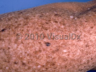 Diffuse hypo- and hyperpigmentation and a variegated brown and gray papule (melanoma) on the arm.
