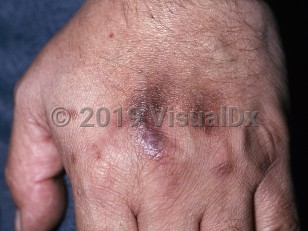 Increased melanin most often produces a brownish pigmentation in the dermis. When active compounds deposit in the dermis, however, there may be associated red-brown, blue-black, blue-gray, purple, or slate discoloration.