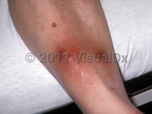 The condition presents as tender, red, erythematous subcutaneous nodules, most frequently on the lower extremities, although they may occur on the breasts, upper extremities, trunk, and buttocks. Long-standing subcutaneous nodules often ulcerate spontaneously and drain a yellow to brown oily material. Given the propensity for this panniculitis to ulcerate, cases have often been misdiagnosed as an infectious process such as necrotizing fasciitis and have thus undergone unnecessary surgical debridement. The distal lower extremities, notably around the ankles and knees, are the most common locations for nodules to ulcerate. Necrosis of the periarticular fat may rarely occur and, in this setting, patients may also experience arthritis involving the ankles and knees. Even rarer associations include necrosis of abdominal fat or bone marrow fat, pleural effusions, mesenteric thrombosis, and eosinophilia.