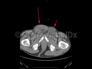 Symptoms from inguinal hernias can vary considerably. The hernia can be seen as an asymptomatic bulge, can cause intermittent discomfort, or be an acute emergency with severe abdominal pain, bowel obstruction, and sepsis if strangulation or bowel obstruction develops. Symptoms typically worsen with increased intraabdominal pressure (eg, prolonged standing, weight lifting).