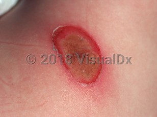 Clinical image of Bullous impetigo - imageId=813507. Click to open in gallery.  caption: 'A close-up of a crusted erosion with a collarette of scale.'