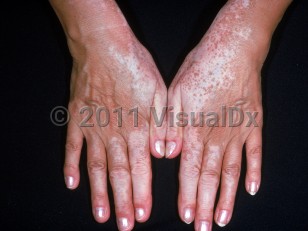 Drug-induced hypopigmentation is most commonly associated with topical agents, such as after prolonged use of topical steroids or retinoic acid. Intralesional, intraarticular, and inhaled corticosteroids have also been associated with local hypopigmentation or depigmentation. The onset may be delayed for up to 4 months. A progressive linear configuration of hypopigmentation has been reported following both intralesional and intraarticular corticosteroid injection. It is thought that this occurs secondary to lymphatic or venous infiltration that occurs at the time of administration. Topical phenols and catechols may cause a vitiligo-like depigmentation at sites of contact (see chemical leukoderma).