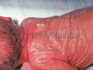 A collodion baby should be considered a presentation rather than an actual diagnosis. Epidermolytic ichthyosis, congenital ichthyosiform erythroderma, lamellar ichthyosis, and several of other genodermatoses with ichthyosis as a component can present as a collodion baby. The newborn appears to be encased in a taut, shiny, thickened stratum corneum. The epidermis can become frayed very rapidly. Barrier function is diminished, and these neonates are at risk for dehydration. Breaks in the cutaneous barrier also place the newborn at risk for bacterial infections. In many cases, the membrane is shed and there is marked spontaneous improvement.