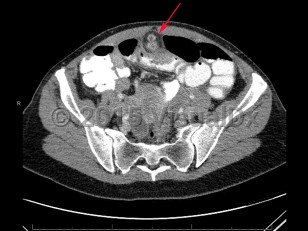 A Meckel diverticulum is a remnant of the omphalomesenteric duct in the distal ileum. Patients with a Meckel diverticulum typically present with painless hematochezia and/or bowel obstruction. Alternatively, a Meckel diverticulum should be considered if an abdominal mass is detected or in cases of abdominal pain, often right lower quadrant, of unclear etiology.