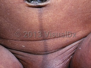 Clinical image of Linea nigra in newborn - imageId=6721692. Click to open in gallery.  caption: 'A prominent linear brown patch on the central lower abdomen.'