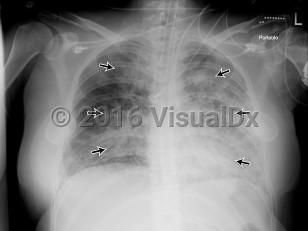 Imaging Studies image of Acute respiratory distress syndrome - imageId=8346315. Click to open in gallery.  caption: '<span>Single portable recumbent AP  view of the chest. A second radiograph obtained 8 hours after initial  radiograph demonstrates diffuse, bilateral airspace opacities, left  greater than right (straight black arrows). In the left hemithorax,  where fewer airspace opacities obscure the periphery of the lung, there  is no convincing evidence of Kerley B lines or pleural thickening (as  one might see in hydrostatic pulmonary edema).</span>'