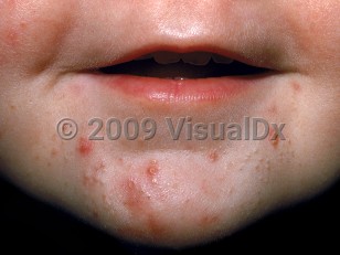 Clinical image of Infantile acne - imageId=2102454. Click to open in gallery.  caption: 'Erythematous acneiform papules and open comedones on the chin of an infant.'