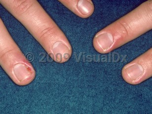 Acute paronychia is generally due to infectious etiologies, while chronic paronychia is typically due to irritants. Medications are also responsible for some acute and chronic paronychias and correlate with the introduction of the drug. Reported drug culprits include retinoids, lamivudine, cyclosporine, indinavir, azidothymidine (AZT), cephalexin, sulfonamides, cetuximab, gefitinib, fluorouracil (5FU), methotrexate, vandetanib, capecitabine, doxorubicin, and docetaxel. The paronychia typically resolves once the medication is discontinued.