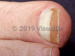 Clinical image of Proximal subungual onychomycosis - imageId=1862878. Click to open in gallery.  caption: 'Diffuse white discoloration of the proximal great toenail.'