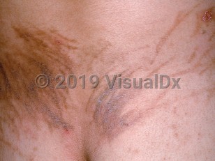 Flagellate erythema appears as linear, whip-like, erythematous streaks on the upper torso and, less frequently, on the extremities. The eruption may be preceded by severe, generalized pruritus and is itself usually very pruritic. Flagellate erythema may occur within 24 hours of receiving the culprit medication, or there may be a lag time of up to 6 months. It has a self-limited course and usually subsides, leaving a residual postinflammatory hyperpigmentation that may persist for months. In some cases, patients note minimal or absent pruritus or erythema, and hyperpigmentation is the initial presentation.