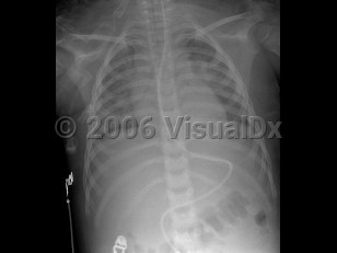 Image from frontal chest x-ray in a child demonstrating bilateral, diffuse interstitial opacities, consistent with pulmonary edema. There is an endotracheal tube in the trachea, as well as an enteric tube extending into the duodenum.
