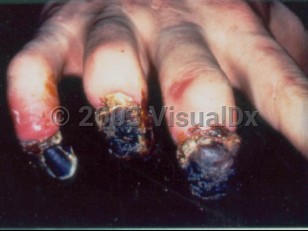 Septicemic plague has sudden onset and rapid progression (with an incubation period of 1-6 days) causing fever, chills, weakness, abdominal pain, shock, and bleeding underneath the skin or other organs and may result in disseminated intravascular coagulation (DIC), necrosis of small vessels, and purpura. Acral regions such as the fingers, toes, and nose may become gangrenous, hence the term "black death." Alone, septicemic plague is rarely transmissible human to human but may become transmissible if the disease reaches the pneumonic stage or is associated with buboes.