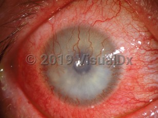 Neovascularization of the cornea, also called corneal pannus, is the growth of blood vessels from the limbus into the cornea. The blood vessels can be very superficial or deep in the corneal stroma. Corneal pannus is often divided into 2 classes: micropannus, which denotes vascular ingrowth of 2 mm or less and macropannus, which is ingrowth of greater than 2 mm. Neovascularization of the cornea is a nonspecific sign of ocular inflammation. Often, the inflammation is sub-clinical and patients will not be aware of the vascularization, nor will they have any visual complaints. Contact lens wear and eyelid inflammation (blepharitis) are classically associated with asymptomatic pannus formation. More obvious causes of inflammation and corneal neovascularization include corneal ulcers, traumatic corneal scars, and atopic keratoconjunctivitis. Though the blood vessels are nonspecific, they do indicate a chronicity of inflammation as blood vessels do not migrate into the cornea acutely.