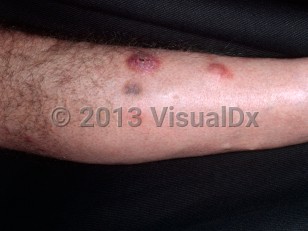 Mycobacterium chelonae is an atypical, rapidly growing mycobacterial organism that causes skin infections in immunocompetent patients. Infection typically follows trauma such as tattooing, piercing, surgery, liposuction, or subcutaneous injections. The skin lesions range from grouped red papules and nodules to disseminated cutaneous abscesses that may follow a linear or sporotrichoid distribution in immunosuppressed patients. Lesions tend to be painful and slow-growing and may heal spontaneously. Most cases are restricted to the skin but can spread to underlying soft tissue and bone. Pulmonary disease and disseminated disease occur rarely. Mycobacterium chelonae infections are uncommon, and most have been reported in young men, but true sex and age predilection are unknown.
