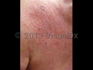 - A symmetrical eczematous eruption (ie, pruritic, erythematous, scaly, subacute, or chronic dermatitis lesions) involving the trunk and extremities (with proclivity for extensor aspects of the extremities)